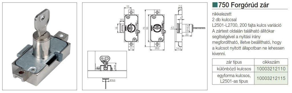 LEHMANN BÚTORZÁR 750 FORGÓRÚDZÁR 15MM-ES, EGYFORMA KULCSOS (L2501) NIKKEL 10003212115