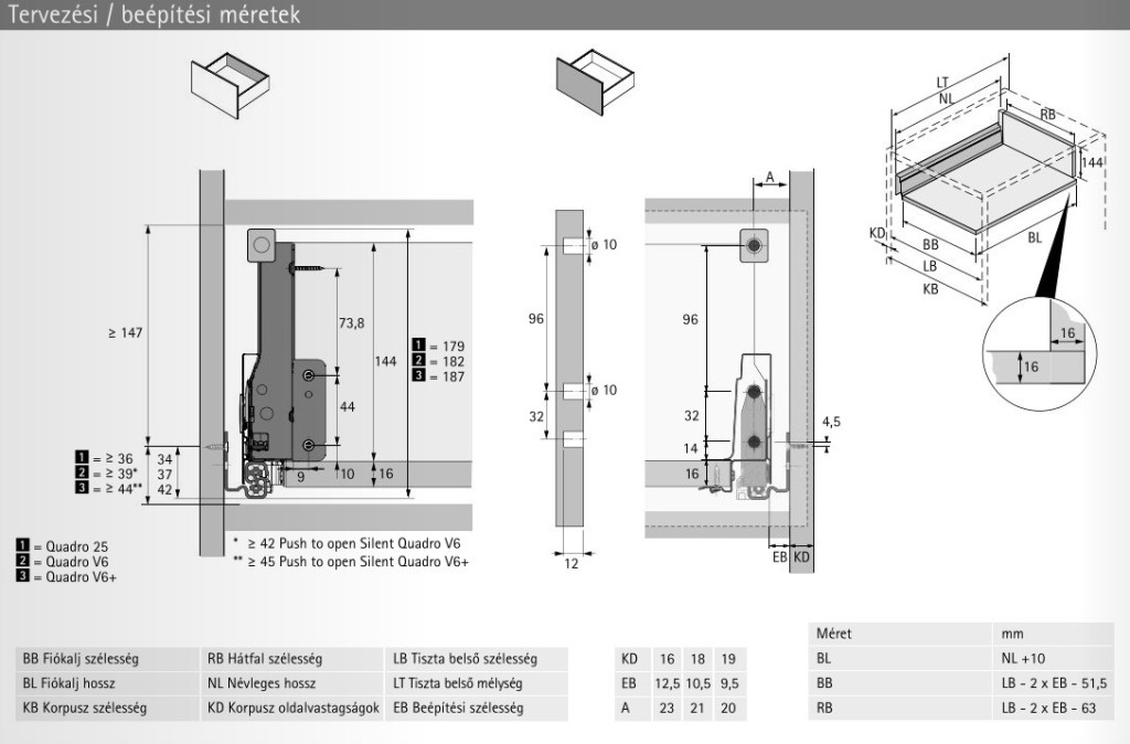 Hettich Innotech Atira duplafalú fiókrendszer Push to open Silent 144mm magas edényfiók korláttal ezüst