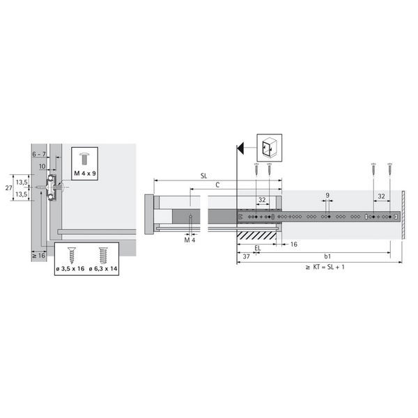 KA 270 golyós sín, horonyba rögzítés, méretek (H x W) 27 x 10 mm, 350 - 550 mm