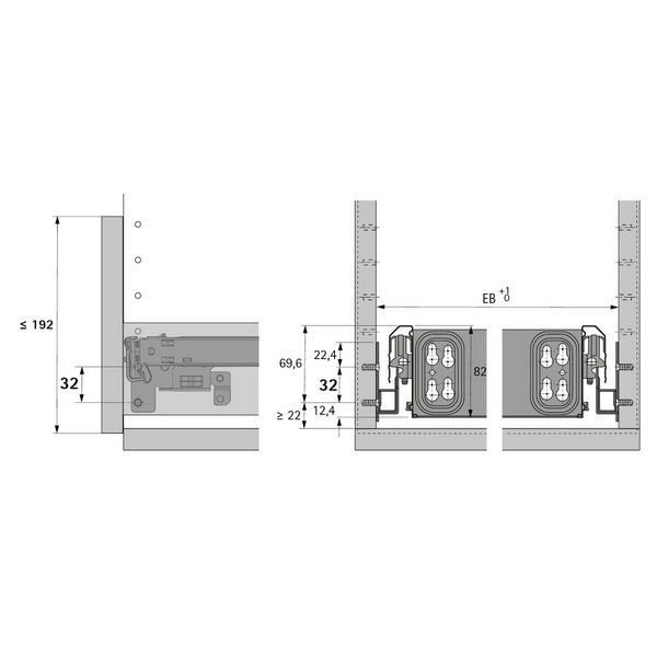 KA 270 golyóscsapágyas sín, Kompatibilis a Silent Systemmel, Kompatibilis Push to open-nel, EB 292 mm / 392 mm, 730 mm, bal