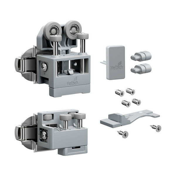 A készlet tartalmazza az összes szerelvényt egy kétszárnyú ajtóhoz, amely szimpla pánttal ellátott futóelemet, az alsó panel alá szerelhető vezetőelemet, a takarósapkát és a rögzítőanyagot tartalmazza.